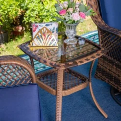 - The table is with tempered glass top and rattan out covered