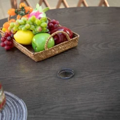 The round metal outdoor dining table wears a rustic and attractive look. It is elaborately hand painted. Its large table top is faux woodgrain finished which is durable, water and weather resistant. The special table features X-crossed legs and adjustable screws that offers extra stability and durability.