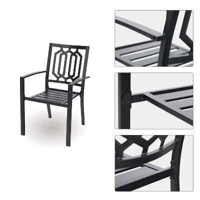 Modern wood-like top with textured black finish table adds charm to your patio area. Large tabletop provides enough space to place food or other items. Umbrella hole fits most umbrellas which can bring you shade in hot weather. 6 ergonomic chairs with high backrest, hollow design of spacious seat and curved armrests provide a firm and comfortable seating experience.